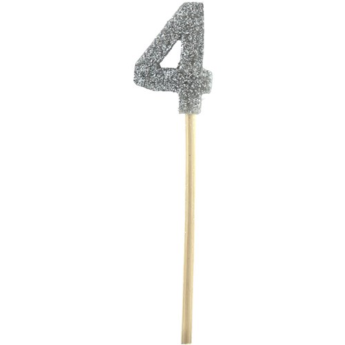Perfect for cake decoration. Beautiful silver glitter numeral candle. 4cm high candle covered in silver glitter, on a 16cm bamboo stick. Excellent quality wax that will burn for hours or for multiple celebrations.