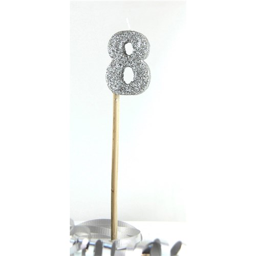 Perfect for cake decoration. Beautiful silver glitter numeral candle. 4cm high candle covered in silver glitter, on a 16cm bamboo stick. Excellent quality wax that will burn for hours or for multiple celebrations.