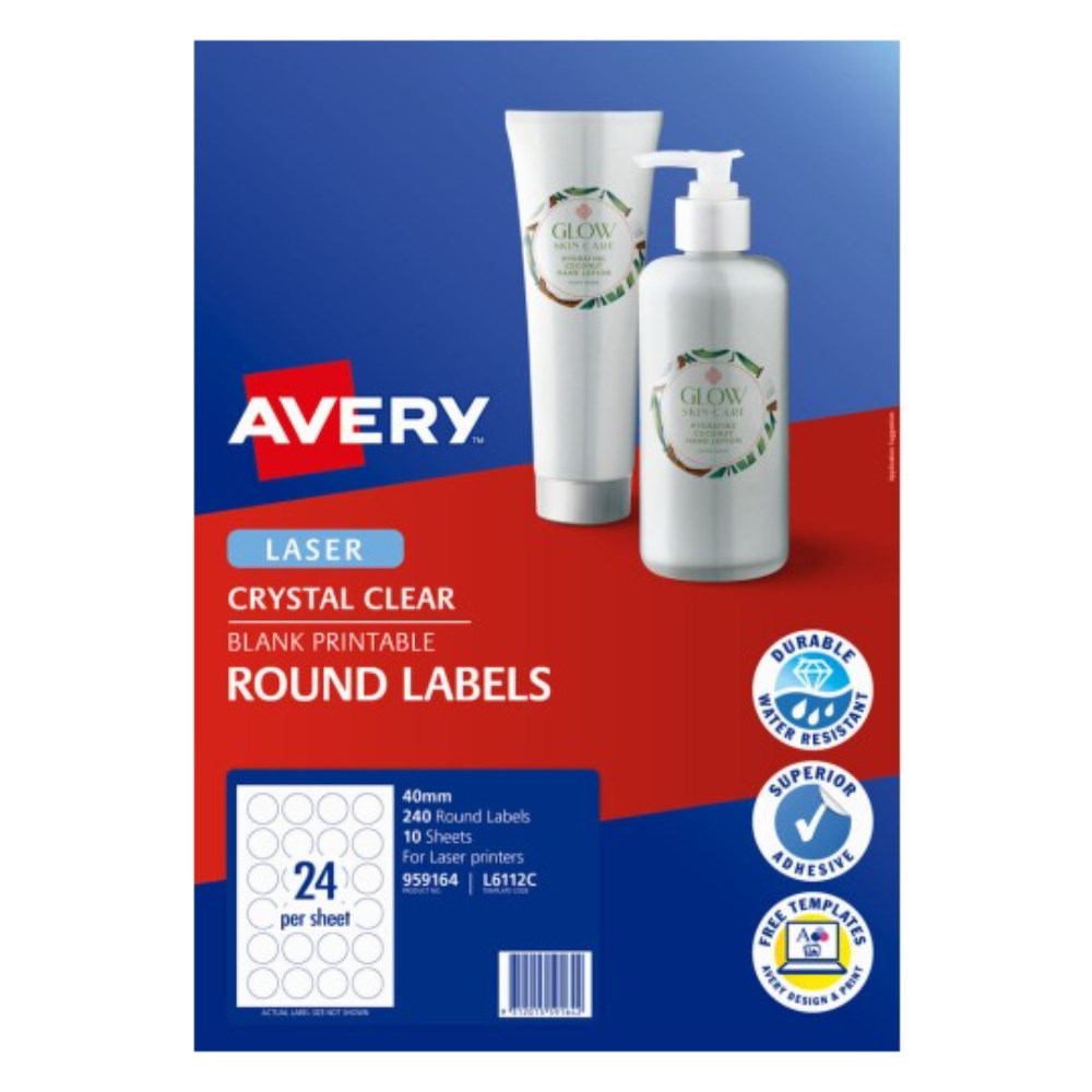 Avery Blank Printable Labels L6112C 40mm Round Clear 24UP 240 Labels 10 Sheets