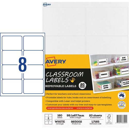 Perfect printable labels for keeping classrooms organised. Labels adhere securely to any smooth surface and can be easily removed when needed FSC certified labels made with paper from well-managed forests. This pack has 160 labels in total, 8UP, 20 Sheets.