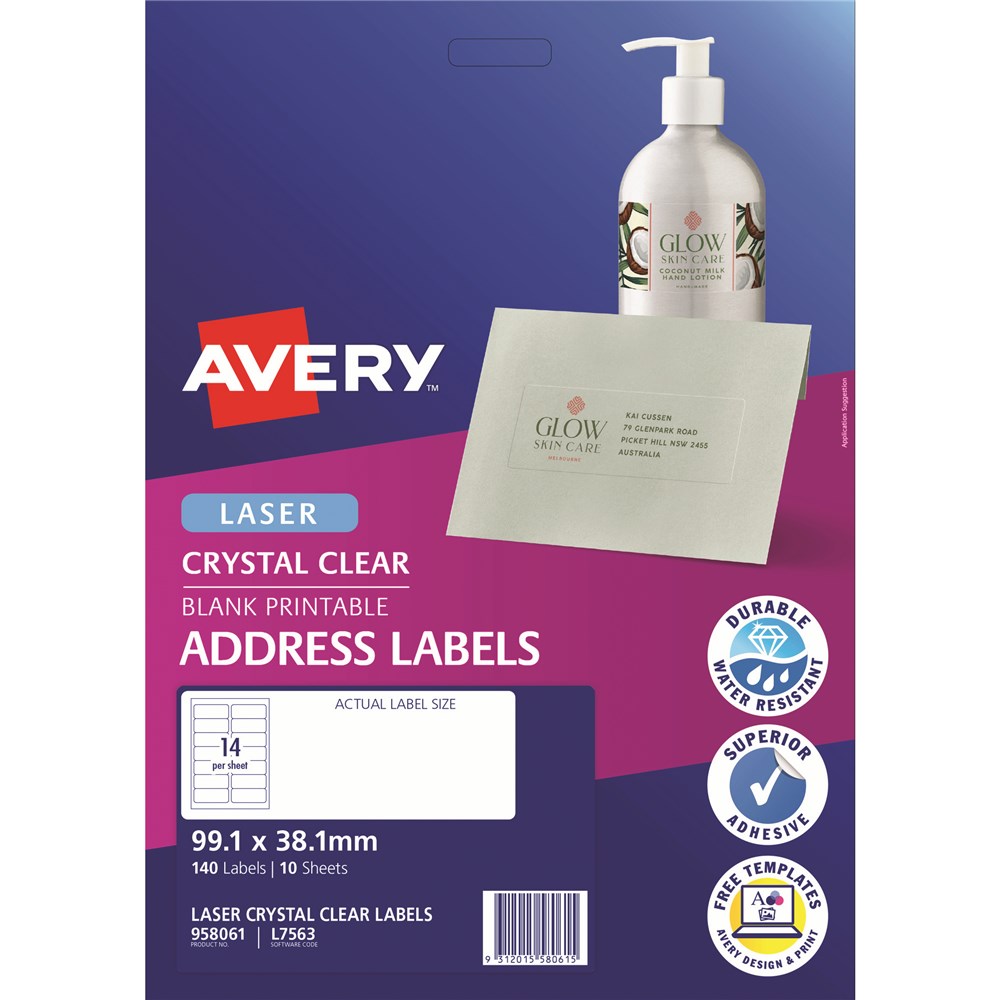 Software Code: L7563. Premium glossy clear material is with superior adhesive. Virtually disappear when applied to white and coloured surfaces. These labels feature Jam-Free technology for reliable trouble free printing, saving you time and minimising waste. Ideal for envelopes, letters and product labelling. Made in Australia.
