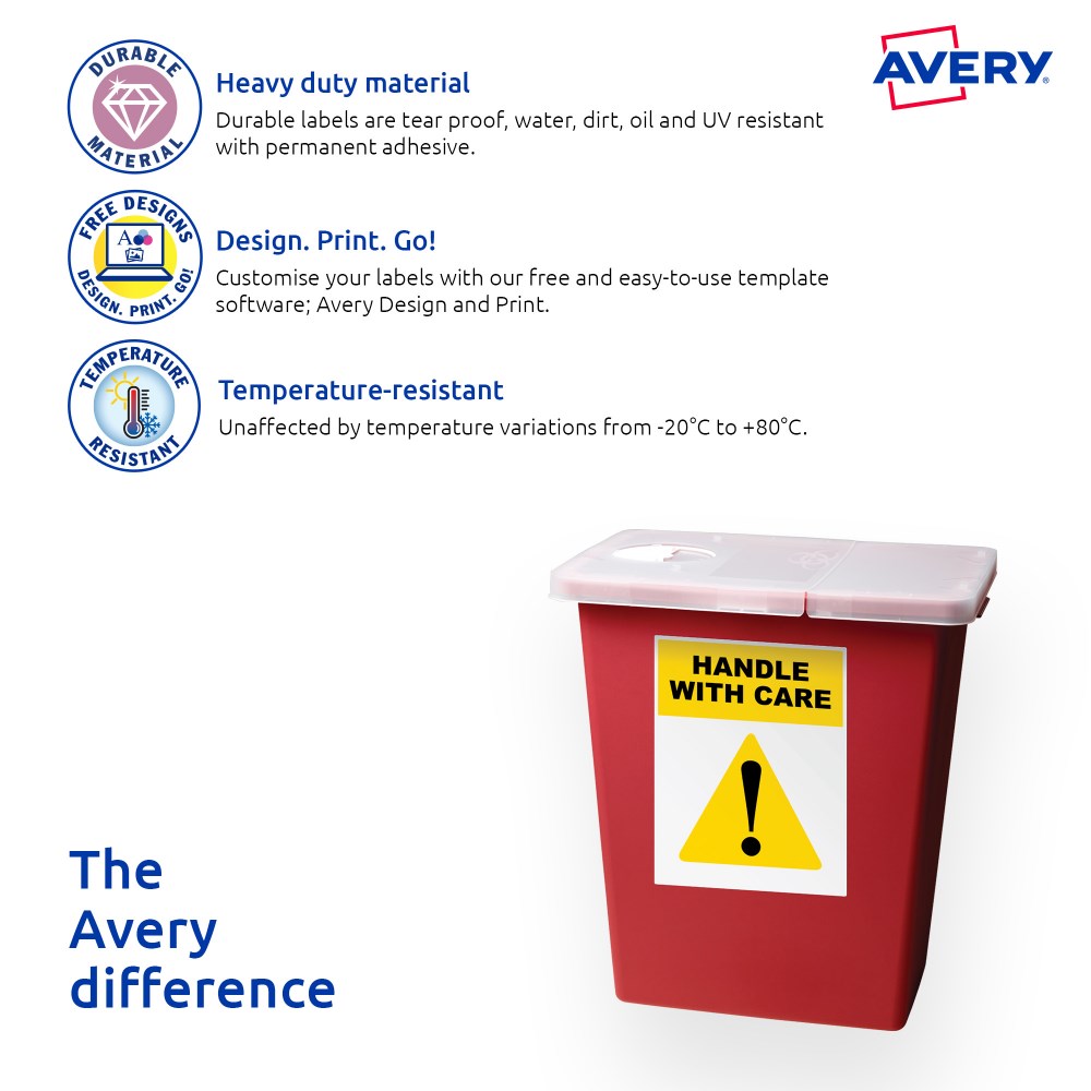 Heavy duty, waterproof, UV, oil and tear resistant unaffected by temperatures between -20°C to 80°C. Ideal for labelling equipment and organising property. Engineered to take on tough applications where a standard label is not fit for purpose. Customise your labels with Avery Design and Print, available at averyproducts.com.au/print. Made in Australia. Size: 199.6x289.1mm 10 labels, 10 sheets. 1 label per sheet (1UP).