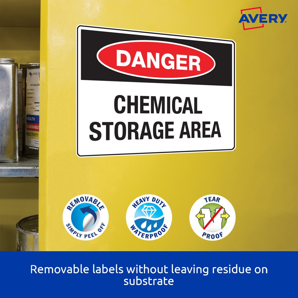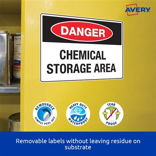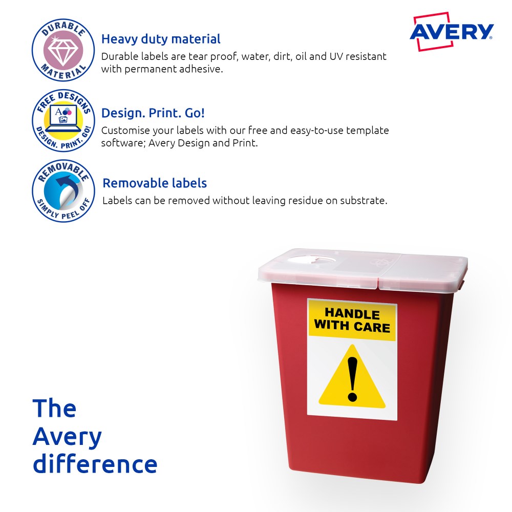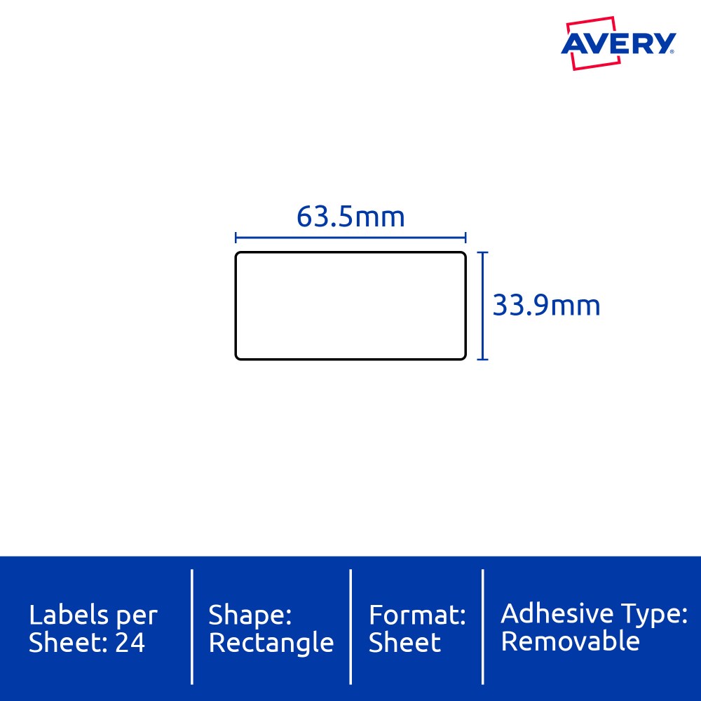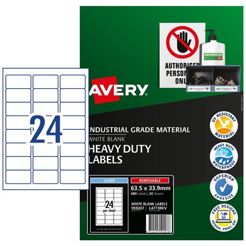 Weather, UV, oil and dirt resistant. Unaffected by temperature variations -20°C to +80°C. Removable adhesive formulated to adhere to a wide variety of surfaces without leaving residue. Ideal for creating temporary labelling of equipment, facilities and storage supplies, stock take and organising workshops. Customise your labels with Avery Design and Print, available at averyproducts.com.au/print. Size: 63.5x33.9mm 480 labels, 20 sheets. 24 labels per sheet (24UP).