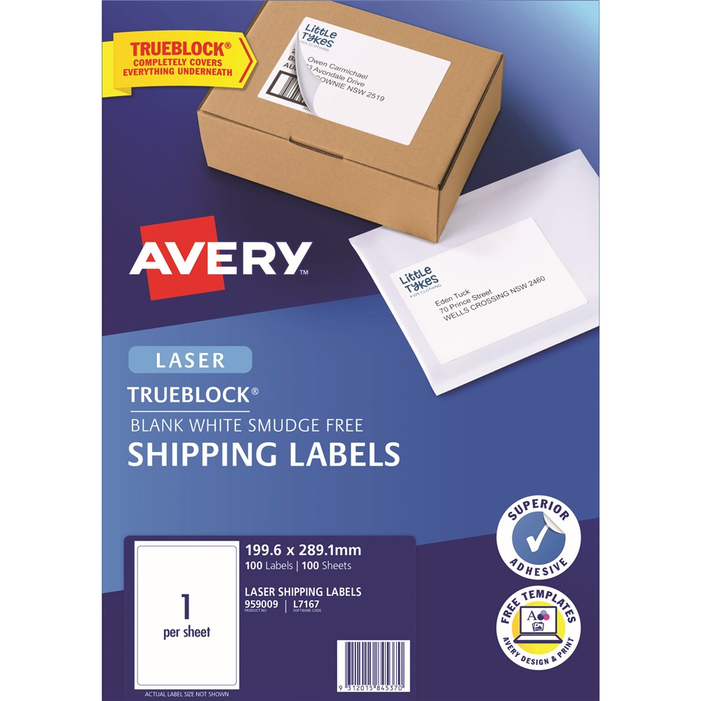 Ideal for addressing and shipping of letters, parcels and boxes. Smudge free. Jam-Free reliability for trouble free printing, saving time and minimising wastage. Trueblock labels feature an opaque black backing which completely covers up and blocks out existing labels or previous information on parcels or boxes. FSC certified labels made with paper from well-managed forests. Size: 199.6x289.1mm 100 labels, 100 sheets. 1 label per sheet (1UP). Customise your labels with Avery Design and Print, available at averyproducts.com.au/print.
