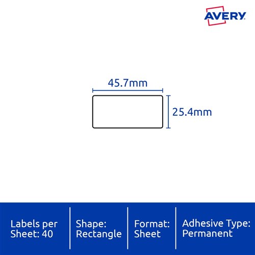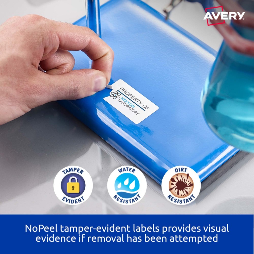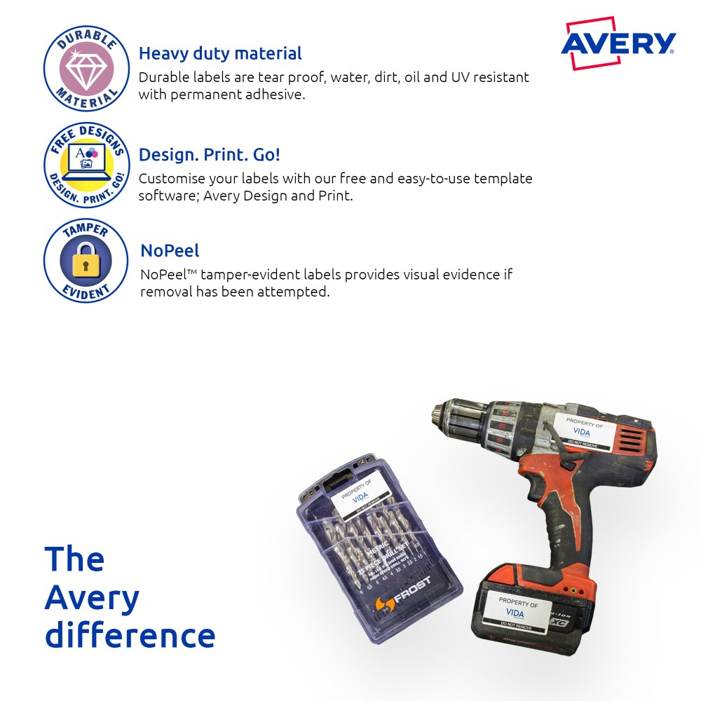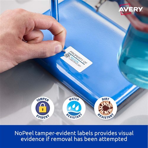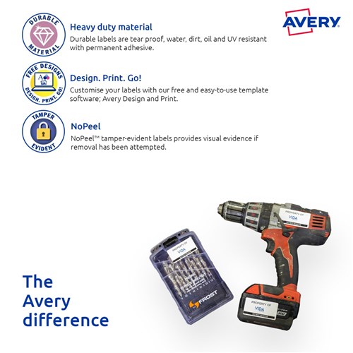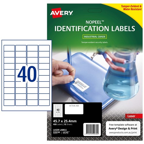 Tamper-evident security solution. If an attempt has been made to remove the label the material flakes and disintegrates, making removal virtually impossible and tampering immediately obvious. Durable labels are tear proof, water, dirt, oil and UV resistant. Unaffected by temperature variations -40°C to +100°C. Applications: for permanent tamper-evident asset labelling for computers, laptops, tablets, smartphones, computer screens, office equipment, tools and machinery. Customise your labels with Avery Design and Print, available at averyproducts.com.au/print. Size: 45.7x25.4mm 400 labels, 10 sheets. 40 labels per sheet (40UP).