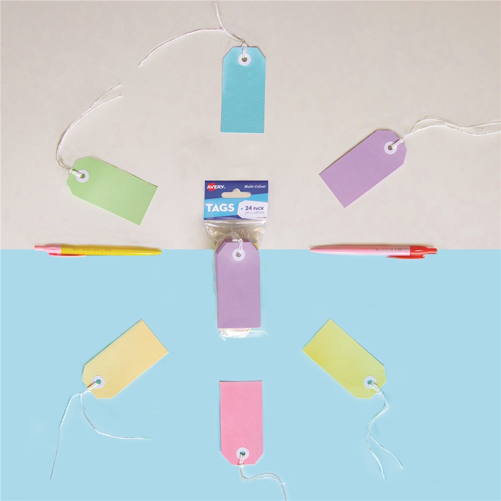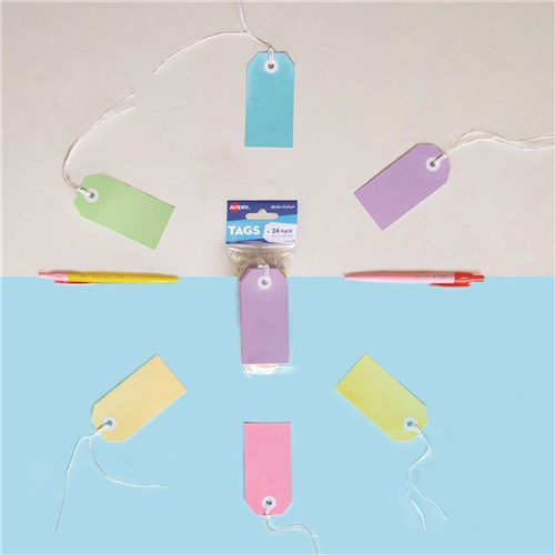 The assortment of pastel colours include: purple, pink, buff, yellow, green and blue. Reinforced hole keeps tag attached without tearing. Durable white paper twine to compliment the white reinforced eyelet. Supplied in a convenient 24 pack perfect for any project. Ideal for gifting, art and craft projects, weddings and events.