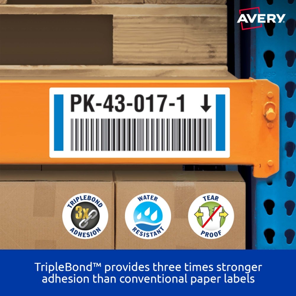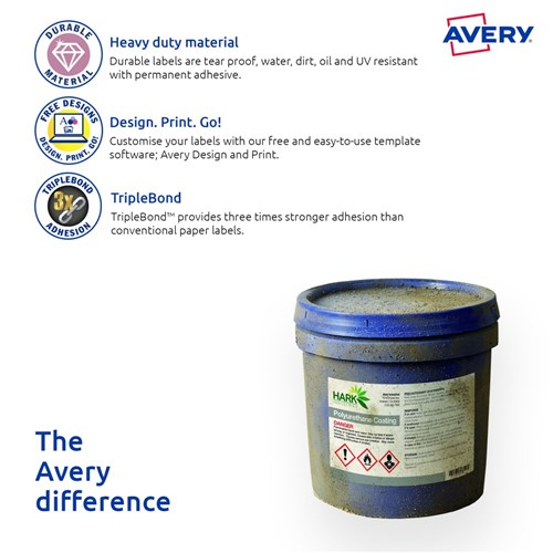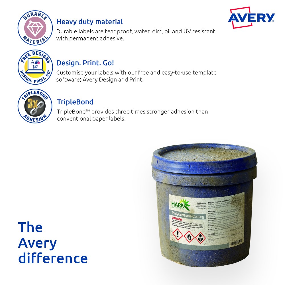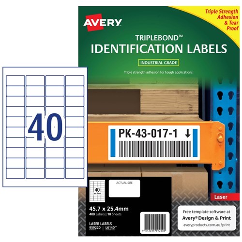 Three times stronger for tough outdoor applications. Tough labels engineered for permanent identification. Durable labels which are oil and dirt resistant, water resistant and tear-proof. Unaffected by temperature variations -40°C to +100°C. Applications: ideal for outdoor applications. For permanent identification for warehouse pallets, racking, machinery and equipment. Identifying outdoor scaffolding, pallet racking, drums, containers, storage cabinets, portable floor stands and barriers. Customise your labels with Avery Design and Print, available at averyproducts.com.au/print. Size: 45.7x25.4mm 400 labels, 10 sheets. 40 labels per sheet (40UP).