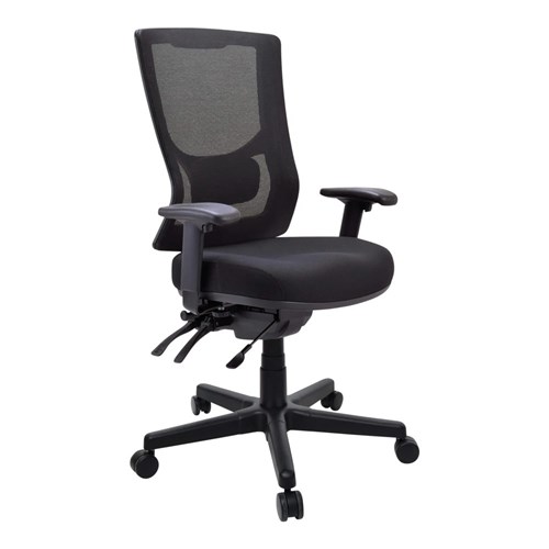 Fabric seat mesh back black. Chair Capacity: 180kg. Composition: Upholstered seat and mesh back, nylon base. Seat Width: 520mm. Seat Depth: 435-485mm. Back Height: 560mm. Indicative Seating Time: Multishift 24/7. 10 Year Manufacturer's Warranty. Delivery, installation and assembly charges may apply to furniture. Please enquire to confirm.