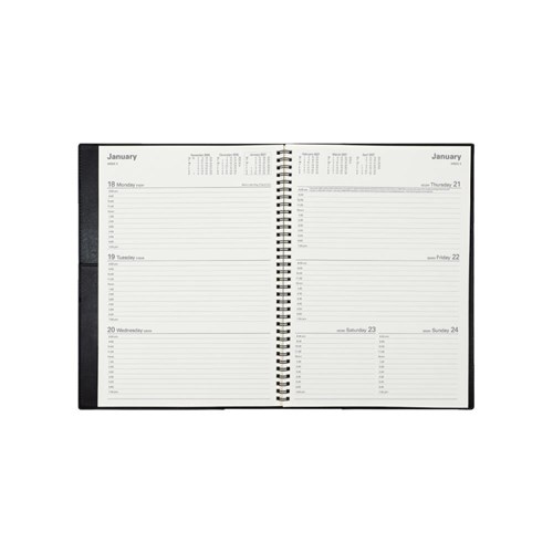 Ideal for those 'on the move' with its double wiro binding and heavily grained metallic and matt PU cover. Has a removable jacket sleeve, pen loop and internal storage pockets. Hourly appointment times. Monthly planners, staff leave and financial summary. 3 year calendars. Addresses and notes. Australian and New Zealand holidays. Current and forward year planners. Tax information.