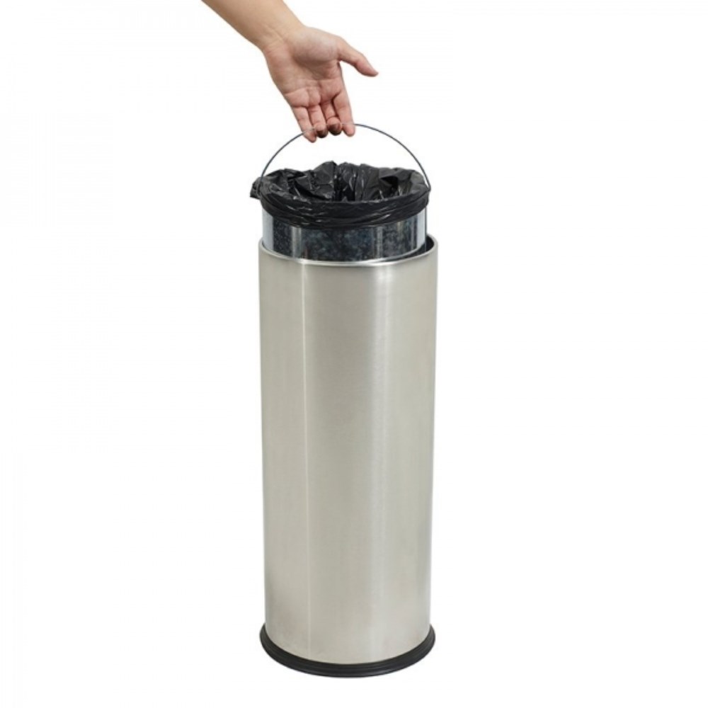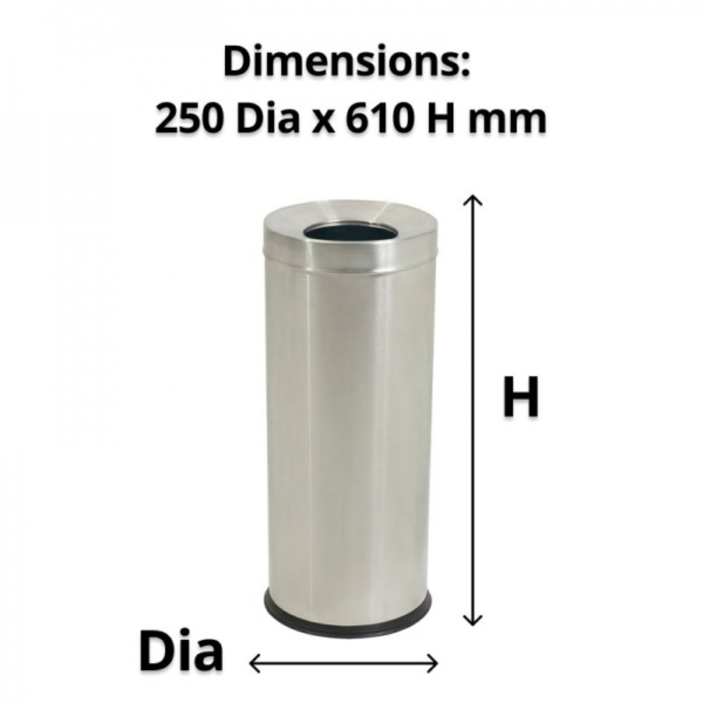 Rubber rimmed base. Ideal for use in public areas. 201 grade stainless steel. Galvanised liner with handle. Dimensions: 250 Diameter x 610mmH. Lid opening diameter: 130 mm.