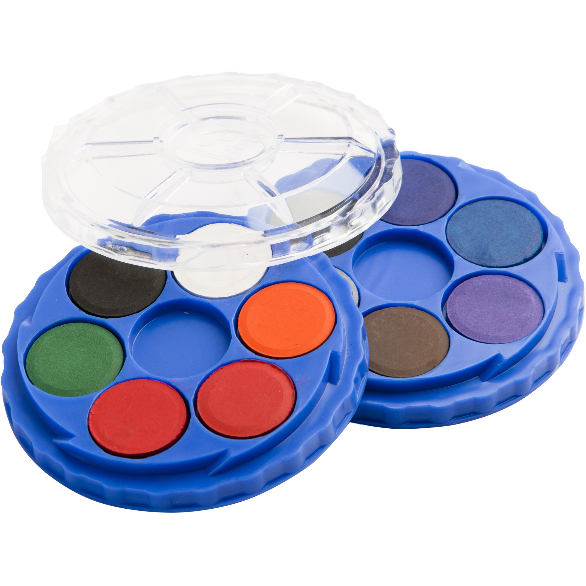 These round paint palettes are filled with high quality 22mm watercolour discs. The trays clever stack and twist design allows easy storage and fast clean up. The small plastic lid can double as a small palette for mixing the 12 colours.