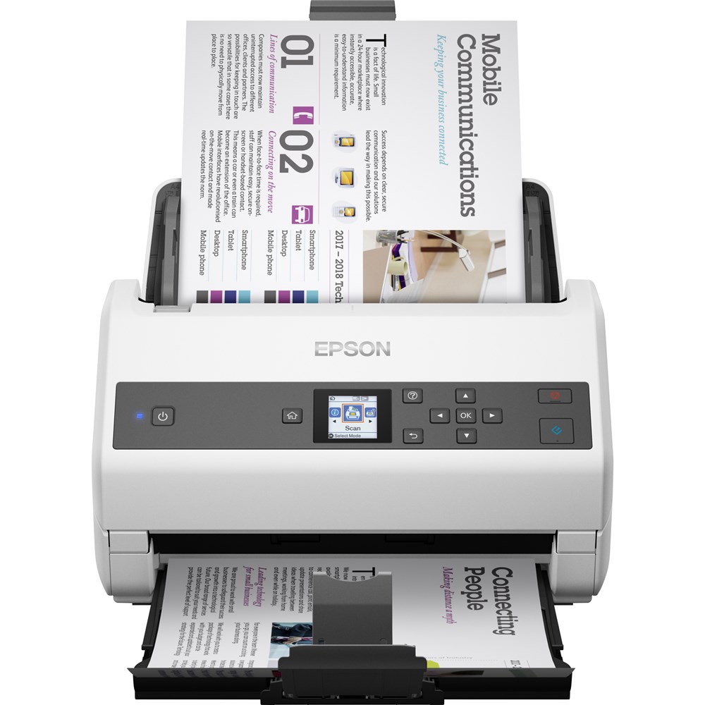 Sheet Feed, one pass duplex A4 colour scanner. Up to 85 ppm/170 ipm; single-pass duplex scanning. High-volume batch scanning - a 100-page Automatic Document Feeder handles even the biggest jobs, offers a peak daily duty cycle of up to 9000 sheets. Includes TWAIN and ISIS drivers for easy integration with existing software; PC and Mac compatible. Colour LCD display and convenient buttons offer easy access to user-defined jobs, settings, modes and maintenance. Scan mixed stacks of business and ID cards, single sheets, long documents, and folded pages up to 11' x 17' (carrier sheet required for folded oversized pages, sold separately). Includes a Slow Speed Mode for delicate sheets; Double-feed Detection and Paper Protection prevent misfeeds. Powerful and compact desktop scanner easily fits within virtually any workspace. Includes Epson Document Capture software to create searchable PDFs, or scan to online storage accounts like Evernote, SharePoint and Google Drive. Optional Flatbed Dock to connect to a compatible Epson photo scanner for scanning photos, passports, or bound materials (both sold separately). 1 Year Manufacturer's Warranty.