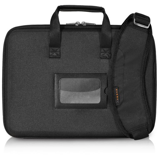 390mm x 280mm x 50mm. High Density Foam. Universal fitting straps and leather handles. Front name tag pocket. Includes shoulder strap. Backed by Everki Limited Lifetime Warranty.