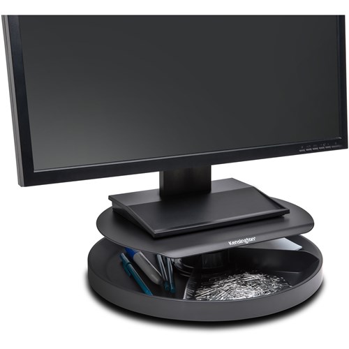 Stand positions monitor in line with your eyes to help reduce eye and neck strain. Patented 360-degree spinning carousel organizes common desktop accessories. Platform fits most widescreen monitors up 18kg. Small footprint helps conserve valuable desktop space.