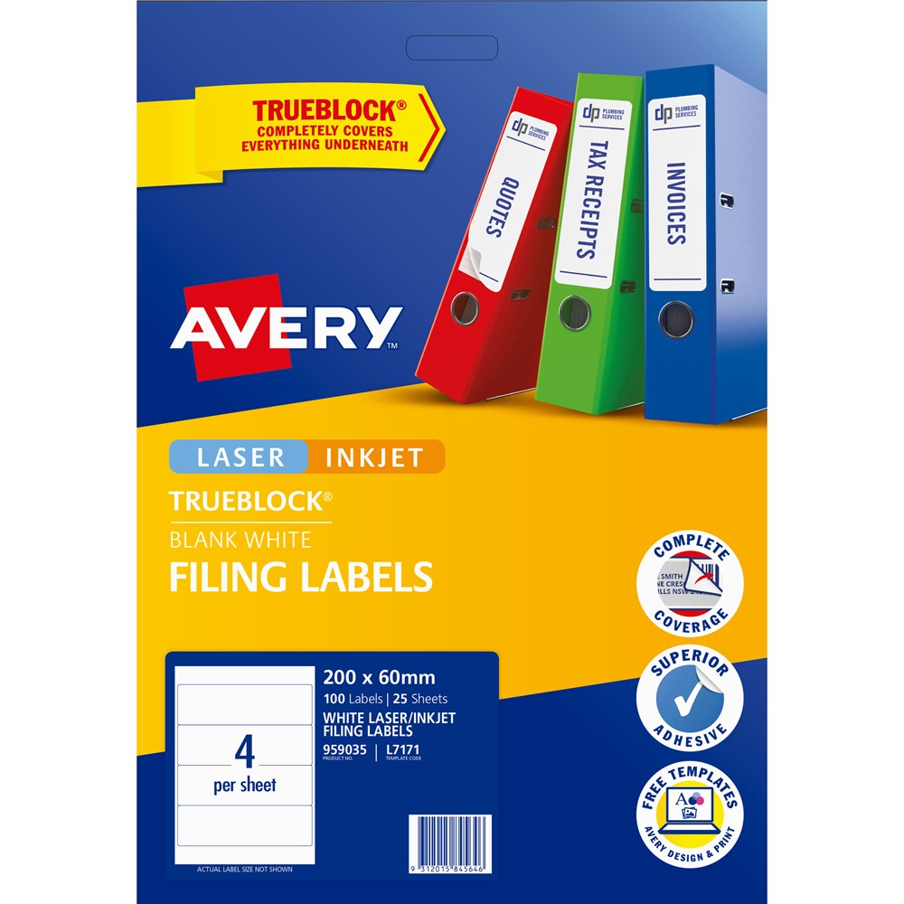 Avery Filing Laser & Inkjet Labels White L7171 200x60mm 4UP 100 Labels 25 Sheets