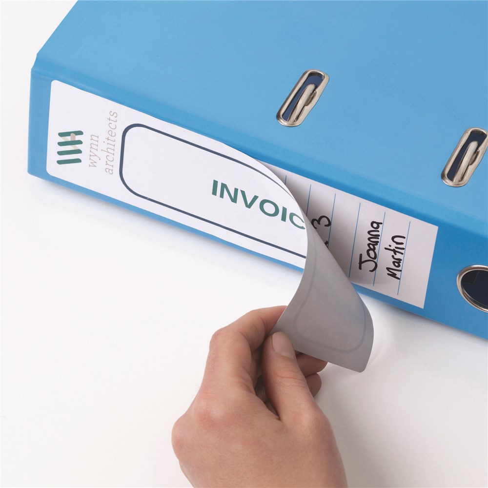 • Specially designed labels to fit the spine of lever arch, ring binders, elasticated folders, box files, suspension files, document wallets and square cut folders.