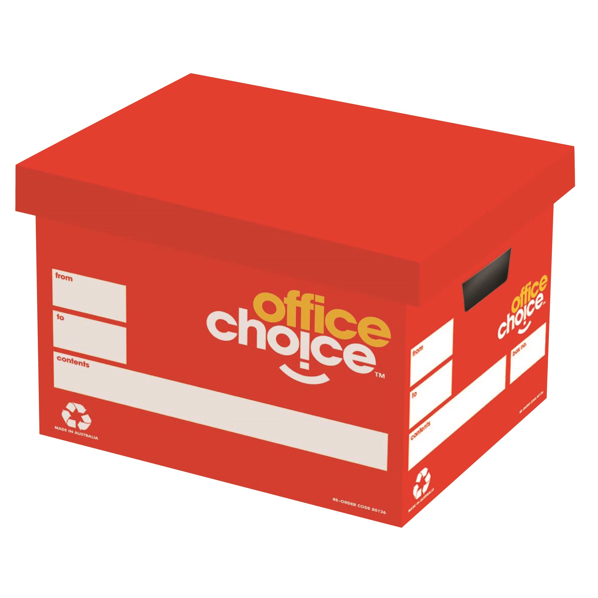 Designed to accommodate computer generated documents as well as sheets up to foolscap size. Lid designed to fit over foolscap suspension files. Stackable with cut out handles for easy carrying. Double end walls and double base ensures up to 25kg of contents will not burst through the base when carried. Australian made from 100% recycled board, and is 100% recyclable.