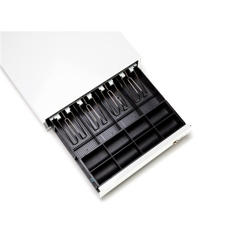 A receipt printer is not required. There are 4 note holders, 8 coin trays for organising currency. It has a durable steel casing. There is a 2-position lock for added security, with 2 keys included. It is colour matched with under counter brackets. The dimensions are 330W x 360D x 90mmH with 80mm cash drawer and 10 mm feet. The cash drawer is a gloss white colour. 1 Year Manufacturer's Warranty.