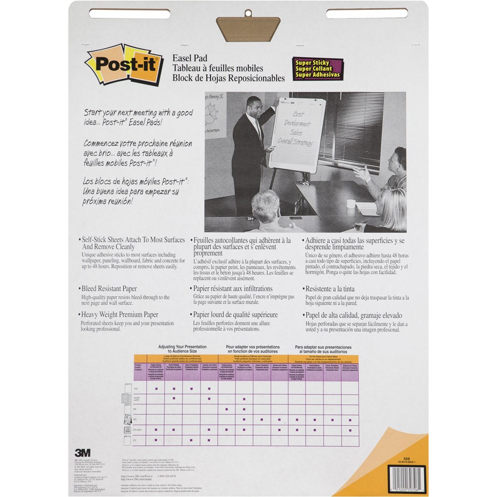 Full-size easel pads ideal for larger presentations, training seminars, large audiences and conferences. Self-stick easel sheets that stick to and remove from almost anything. 30 sheets per pad.