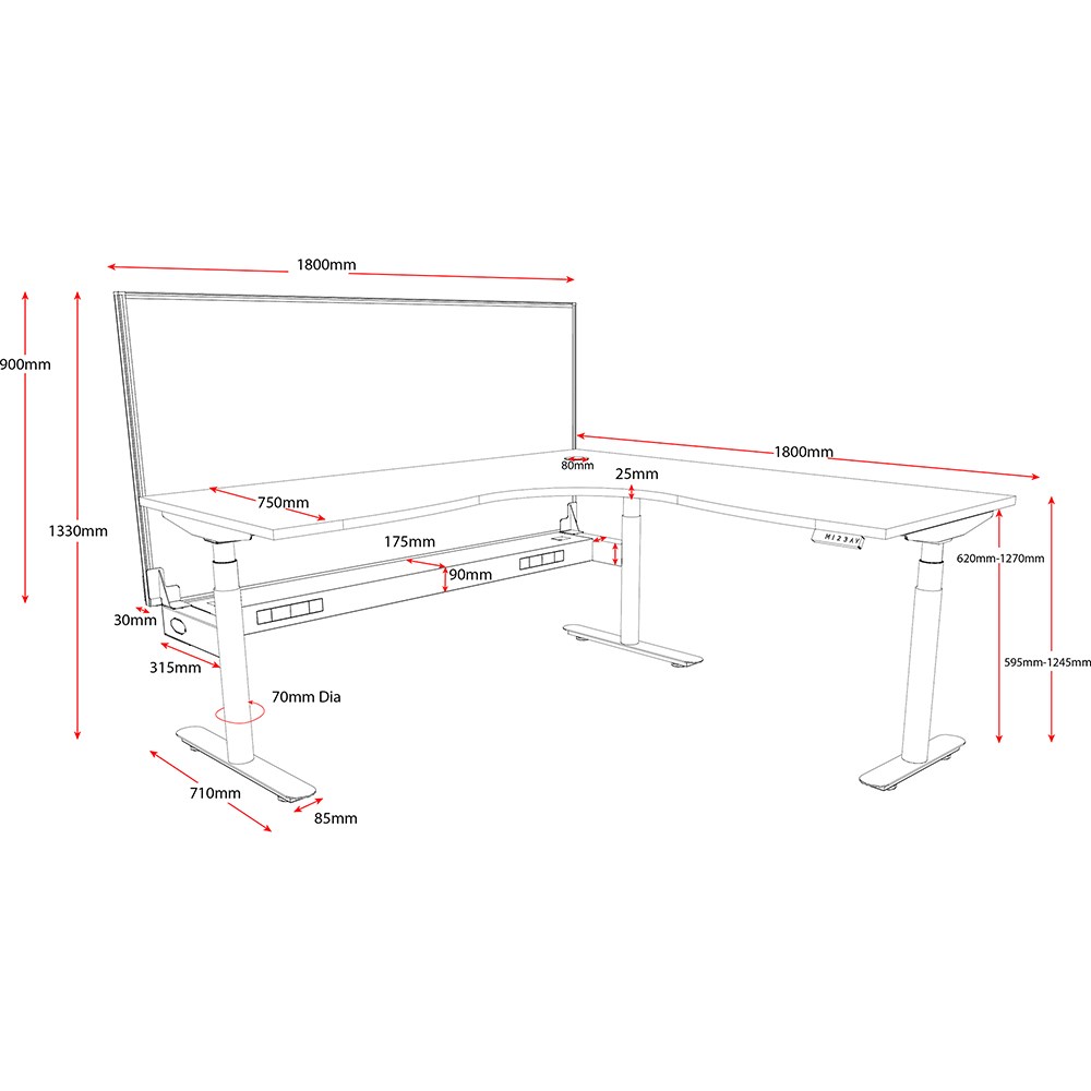 Natural Oak top with Black frame. Unit Dimension: 1800/1800mm W x 750mm D x 1330mm H. 620-1270mm height range for desk. E0 rated top. Powdercoat base. Digital control panel with 3 pre-set positions, LED display panel, keypad safety lock & reminder alarm setting. Anti-collision technology, noise emission of less than 50DB. Lifting capacity of 120kg with a max speed of 38mm per second. 70mm diameter round column legs. 700mm wide foot size with adjustable leveling feet, return foot: 700mm. Comes with 30mm thick privacy screens and cable tray for cable management. 10 Year Manufacturer's Warranty. Delivery, installation and assembly charges may apply to furniture. Please enquire to confirm.