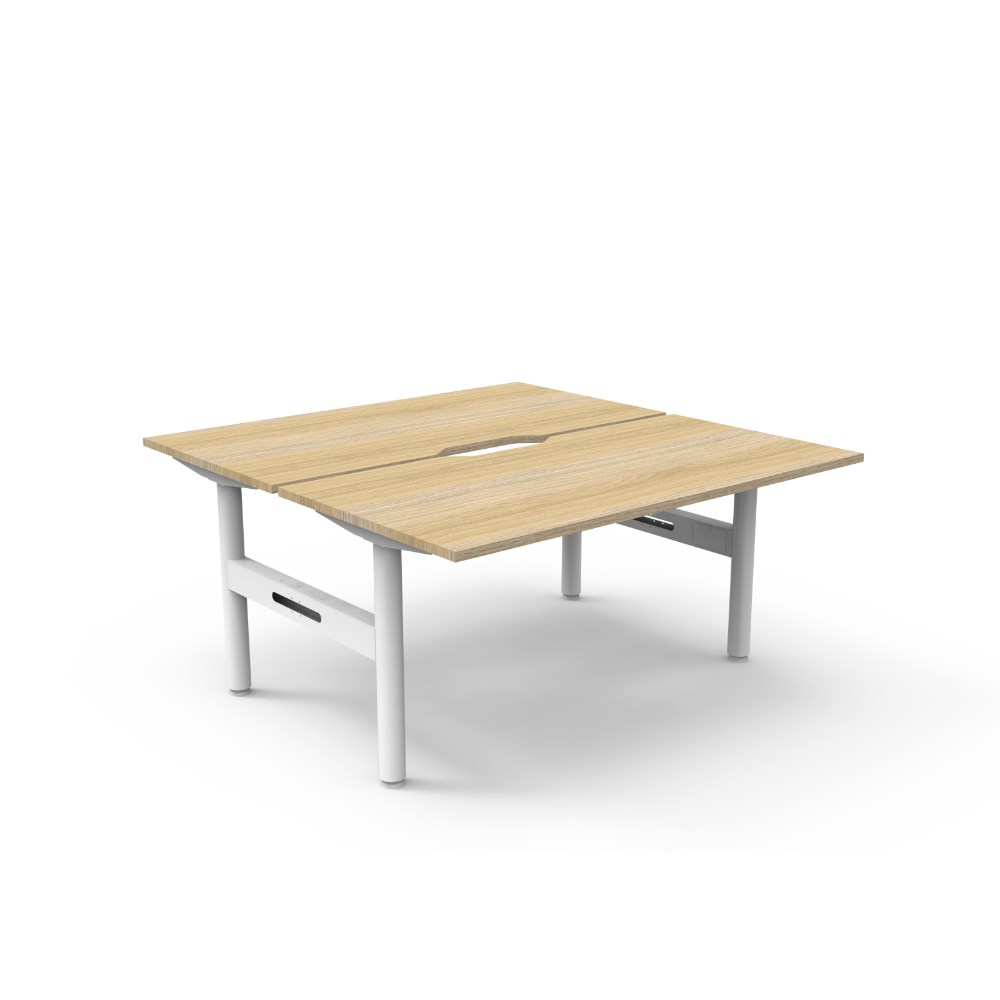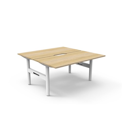 Natural Oak top White Satin frame. Overall Dimensions: 1500mW x 1500D x 730mmH. Per User Dimensions: 1500W x 750D x 730mmH. E0 rated 25mm top with rigid edging and 50mm diameter scallop cut out to rear. Powder coated underframe. Adjustable levelling feet. Can be customised with optional accessories like cable management solutions and privacy screens. 10 Year Manufacturer's Warranty. Delivery, installation and assembly charges may apply to furniture. Please enquire to confirm.