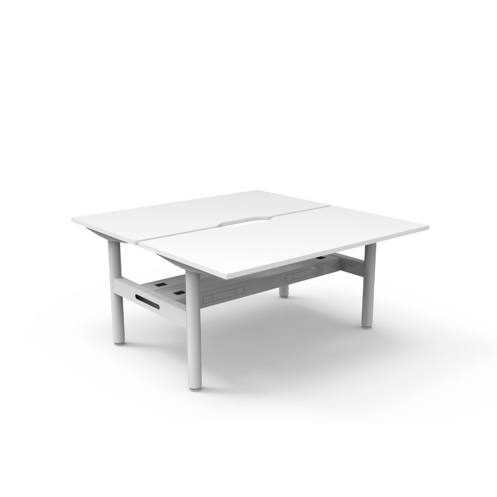 Natural White top White Satin frame. Double sided workstation with cable tray. Overall Dimensions: 1500mW x 1500D x 730mmH. Per User Dimensions: 1500W x 750D x 730mmH. E0 rated 25mm top with rigid edging and 50mm diameter scallop cut out to rear. Powder coated underframe. Adjustable levelling feet. Can be customised with optional accessories like cable management solutions and privacy screens. 10 Year Manufacturer's Warranty. Delivery, installation and assembly charges may apply to furniture. Please enquire to confirm.
