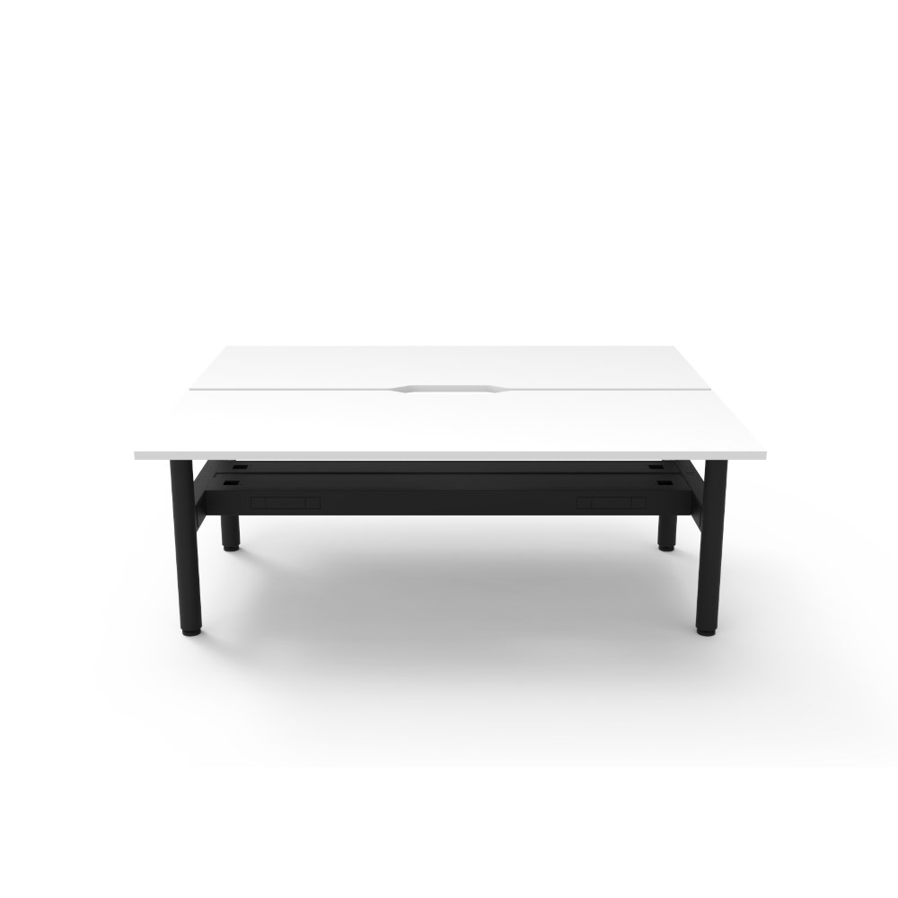 Natural White top Black Satin frame. Double sided workstation with cable tray. Overall Dimensions: 1800mW x 1500D x 730mmH. Per User Dimensions: 1800W x 750D x 730mmH. E0 rated 25mm top with rigid edging and 50mm diameter scallop cut out to rear. Powder coated underframe. Adjustable levelling feet. Can be customised with optional accessories like cable management solutions and privacy screens. 10 Year Manufacturer's Warranty. Delivery, installation and assembly charges may apply to furniture. Please enquire to confirm.