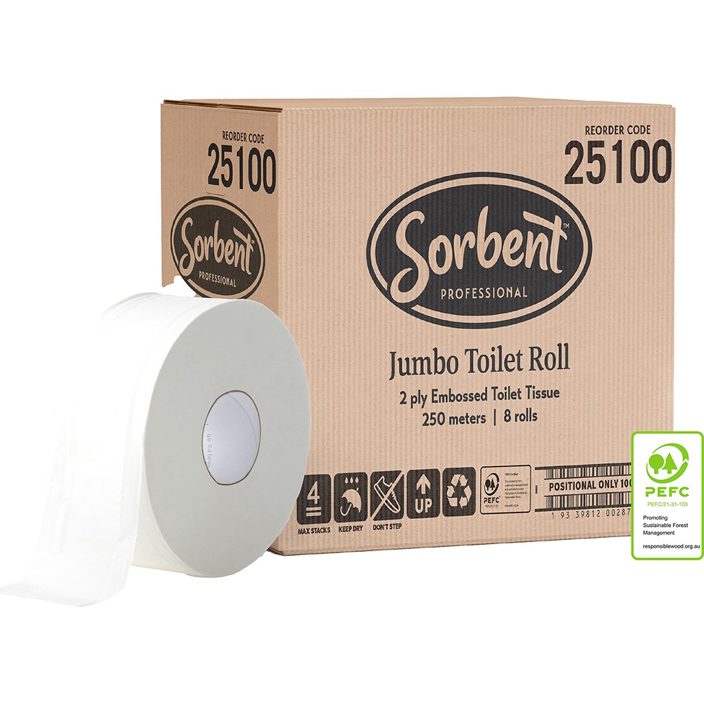 Australia's favourite toilet paper brand has designed a professional range, especially for businesses that expect the quality of an iconic Australian brand. Two layers of extra thickness with double embossing for the softness and comfort of home in a jumbo roll for high traffic areas. Inclean Excellence Award to delight even the most discerning user in a high traffic area. 100% sustainable virgin fibre, which is independently certified annually by PEFC, ensures environmental responsibility. Compatible with Sorbent Professional 25504 and 25505 dispensers.
