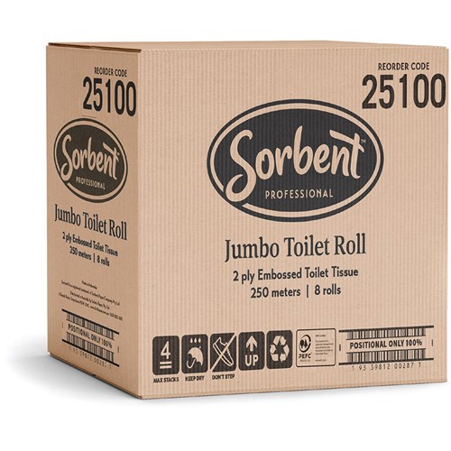 Sorbent Professional Jumbo Toilet Tissue Rolls 2 Ply 250m Carton Of 8