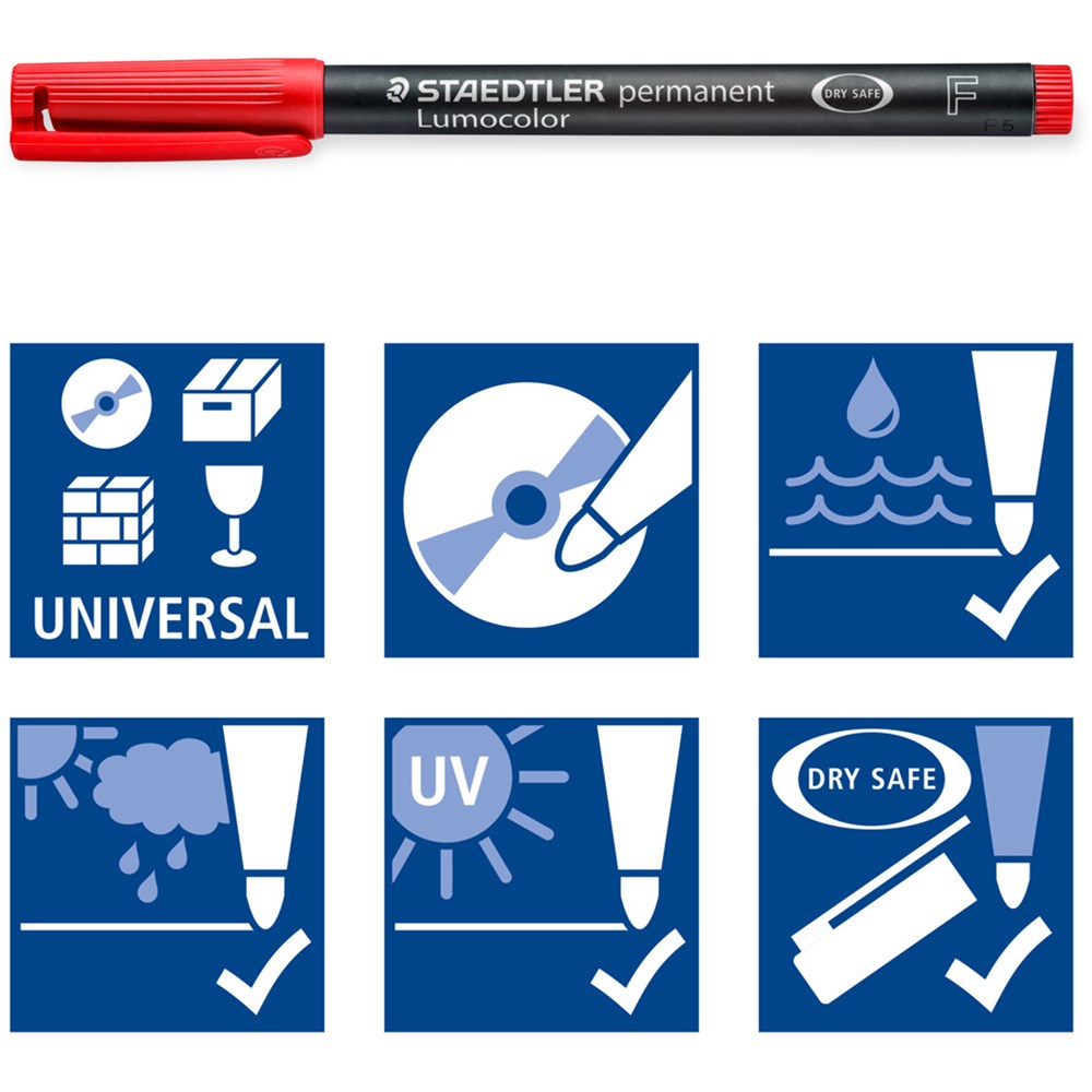 • Ideal for writing on smooth and glossy surfaces such as film, glass, ceramic, plastic, metal, paper, courier bags, wood, fabric or CDs, DVDs & OHPs.