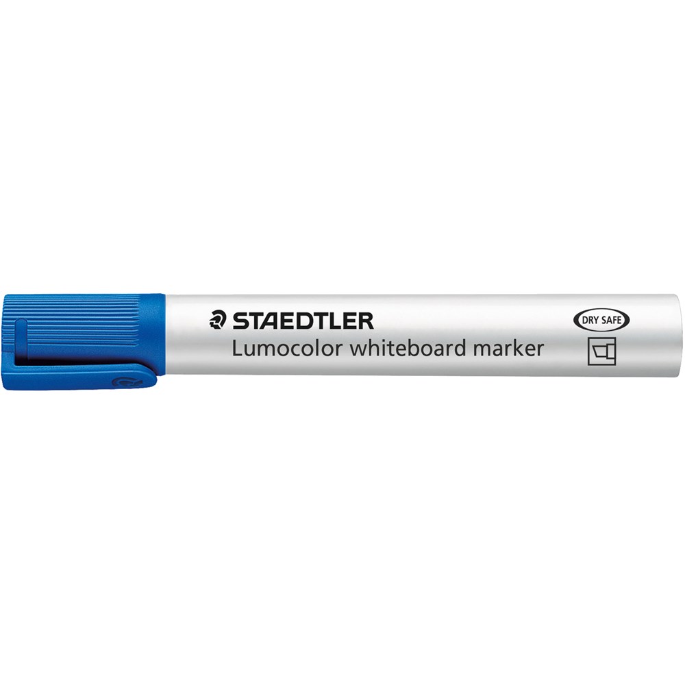 Blue marker can be dry-wiped from whiteboards and surfaces such as glass and porcelain without leaving a trace Airplane-safe Fast drying, low odour and with convenient clip cap Dry safe Stand-up staedtler box converts to convenient desk set Refillable xylene and toluene free ink Polypropylene barrel and cap guarantee long service life Chisel tip line width approximately 2 - 5mm