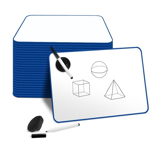 Pack includes 25 Whiteboards and 25 VA0006 Magnetic Eraser and holder with marker. 50mm diameter eraser, Black fine point whiteboard pen. Both sides blank for versatile learning. Reusable, wipe-clean surface reduces paper waste. Lightweight and easy for students to handle. Ideal for writing, drawing, maths and problem-solving. Supports group work, interactive lessons and games. Blue-framed, durable design for classroom use. Perfect bulk option for resellers and schools. 2 Year Manufacturer's Warranty.