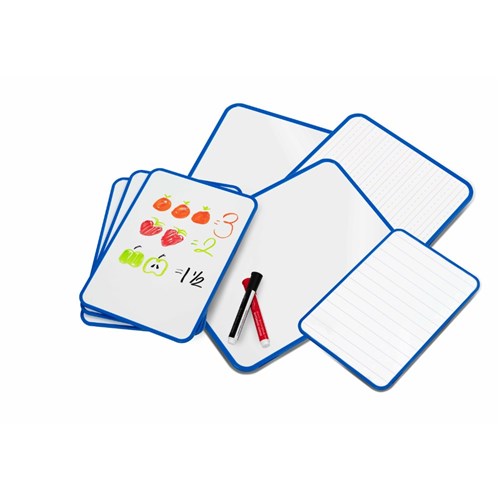 Double sided, Plain both sides. Lightweight magnetic whiteboards ideal for agile education. Great for collaborative group and individual focused learning. Add the optional Magnetic eraser/marker to make a complete individual student whiteboard solution, please see product 3039136. Size: 420W x 297mmH. Sturdy navy blue moulded frame. Save paper and allow students to practice skills. Use any whiteboard markers, wipes clean easily.